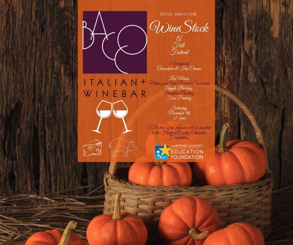 Please join us Saturday afternoon from 12pm to 5pm here on our patio and in front of the restaurant for our first Fall Wine Festival. A portion of the proceeds will benefit The Harford County Education Foundation. We will have 5 Vineyards on site. Charcuterie & Fine Cheeses along with additional outside food and refreshment options available on the patio. $5 wine samples & $9 full glasses also available outside all afternoon. This will be a family friendly event. Bacco will be open inside as well. There will be live music, pumpkin painting, apple bobbing, face painting. marshmallow roasting, DIY pumpkin succulents & floral arrangements. We will be featuring Italian & California WInes, as well as local Boordy Vineyard.