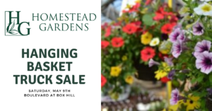 Pop in and grab a gift for Mom that she can enjoy all season. Order your 10″ hanging basket and pick it up on Saturday just in time for Mother’s Day. Homestead Gardens is offering locally-grown flowering annuals that bloom all summer long in a wide variety of brilliant colors, combos, and textures! The cost is 1 for $15 or 3 for $30.