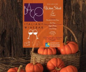 Please join us Saturday afternoon from 12pm to 5pm here on our patio and in front of the restaurant for our first Fall Wine Festival. A portion of the proceeds will benefit The Harford County Education Foundation. We will have 5 Vineyards on site. Charcuterie & Fine Cheeses along with additional outside food and refreshment options available on the patio. $5 wine samples & $9 full glasses also available outside all afternoon. This will be a family friendly event. Bacco will be open inside as well. There will be live music, pumpkin painting, apple bobbing, face painting. marshmallow roasting, DIY pumpkin succulents & floral arrangements. We will be featuring Italian & California WInes, as well as local Boordy Vineyard.